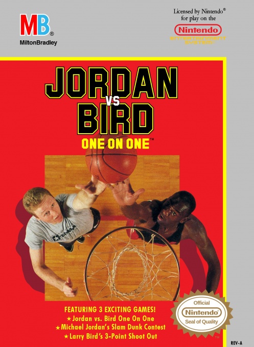美国发行的正版《乔丹对伯德:一对一篮球》,经典篮球明星授权游戏,玩家操控乔丹或伯德展开一对一篮球对战,融合篮球特技、趣味竞赛与明星技能,画面为卡通像素风,界面为英文,是 FC 体育游戏经典。