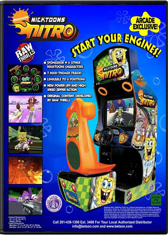 Raw Thrills 开发的街机卡通竞速游戏,2008 年首发,是《Nicktoons Racing》系列第三部作品,主打跨界 IP 联动与轻松欢乐的竞速体验。游戏集结《海绵宝宝》《幻影丹尼》《吉米 Neutron》《降世神通:最后的气宗》等多个尼克卡通 IP 角色,共收录 7 名可操作角色,其中海绵宝宝由原版配音演员配音,其余角色为无声设定,同时新增原创反派角色 Lord Nitro。剧情围绕卡通角色被 Lord Nitro 绑架展开,玩家需操控角色驾驶专属车辆,在基于各角色家园设计的赛道上竞速,既要争夺胜利,也要逃离 Lord Nitro 的掌控,通关所有 6 条赛道后,需与 Lord Nitro 展开最终竞速,获胜后即可解锁角色回归家园的结局。核心玩法类似马里奥赛车,融入道具系统与隐藏近道,支持单人与双人联机,画面采用可爱的卡通风格,角色与赛道造型贴合 IP 设定,操作简单易上手,兼顾休闲与竞技,是卡通 IP 粉丝与全年龄段玩家的休闲竞速之选。
